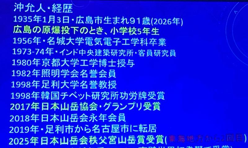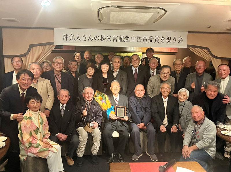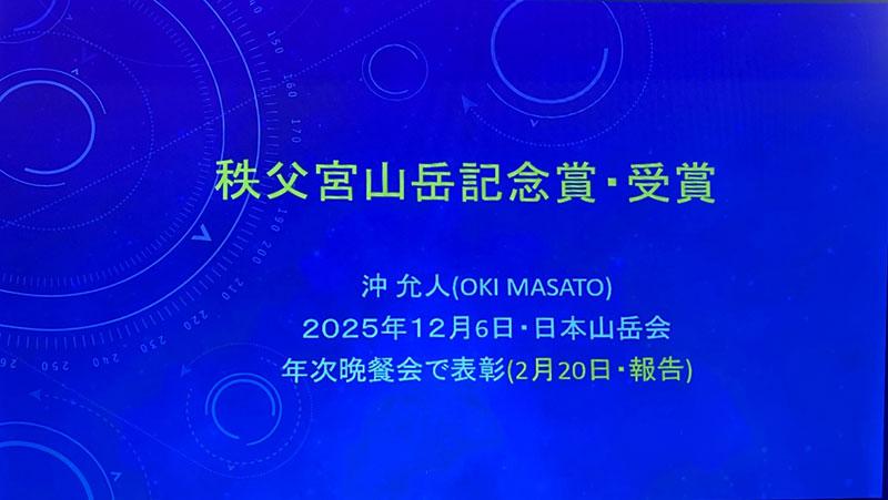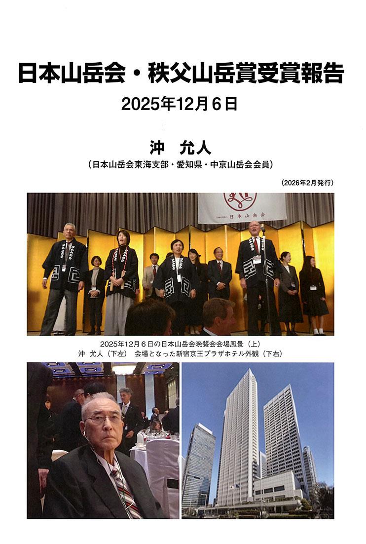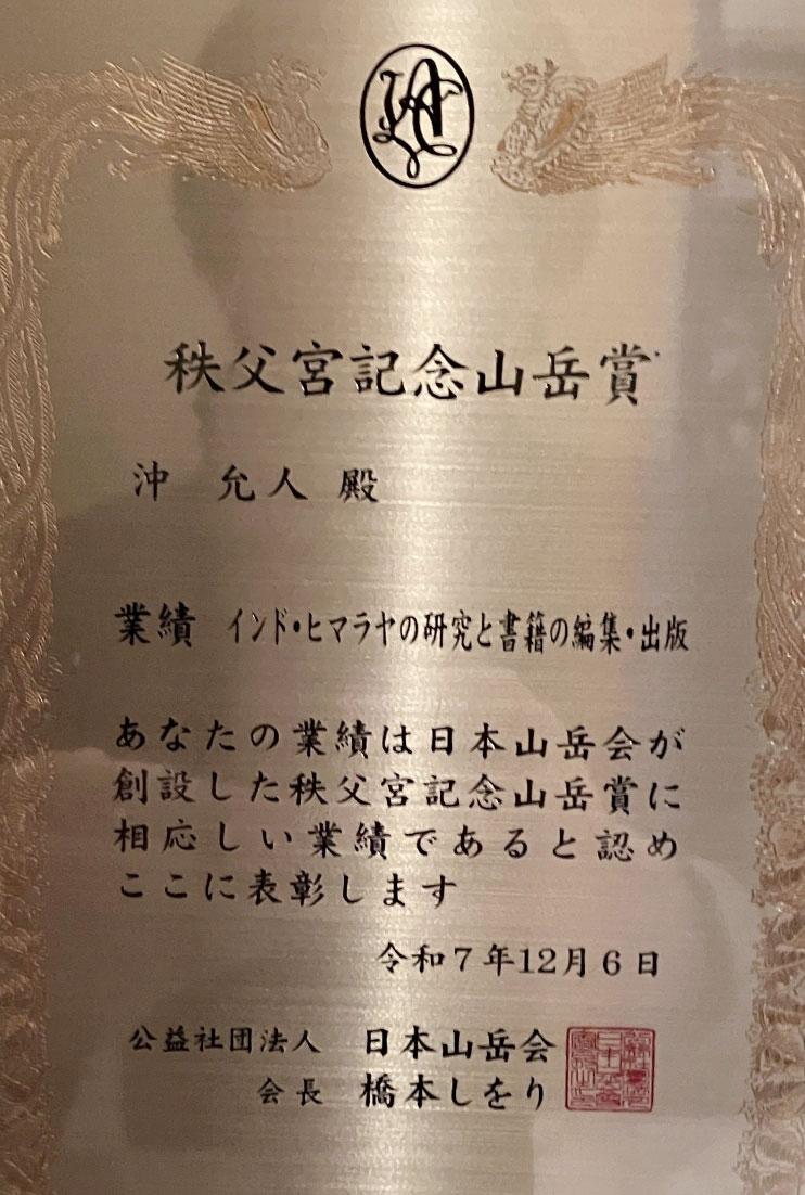 沖先生は日本山岳会の永年会員であり、この度、日本山岳会の山岳に関する文化・学術活動に顕著な功績があったとして、第27回「秩父宮記念山岳賞」を受賞されました。受賞理由としては、長年にわたるインド・ヒマラヤ登山の実践と研究、併せて「インド・ヒマラヤ」の出版(日本語版、英語版)が高く評価されたものです。なお、表彰式は令和7年12月6日に新宿京王プラザホテルにて行われています。